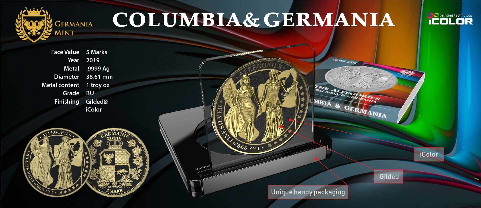 Germania 2019 5 Mark Allegories Columbia 1 Oz Silver Coin Black Varnish & Gilded