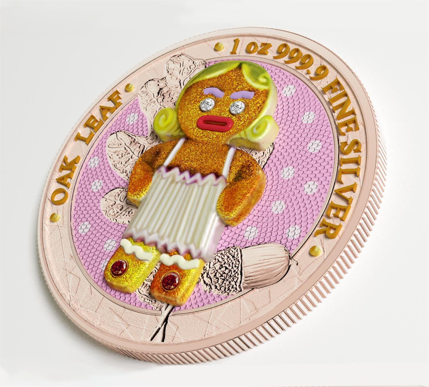 The *Lady Blondie Edition* is distinguished by its sterling silver insert of a graceful blonde woman, carefully crafted to evoke charm and beauty. The oak leaf, symbolizing strength and grace, is brought to life with a 3D effect, creating a sense of depth and realism that perfectly frames the Lady Blondie figure. Her blonde hair and delicate features contrast beautifully with the fine silver, adding a soft yet striking visual appeal to the coin.