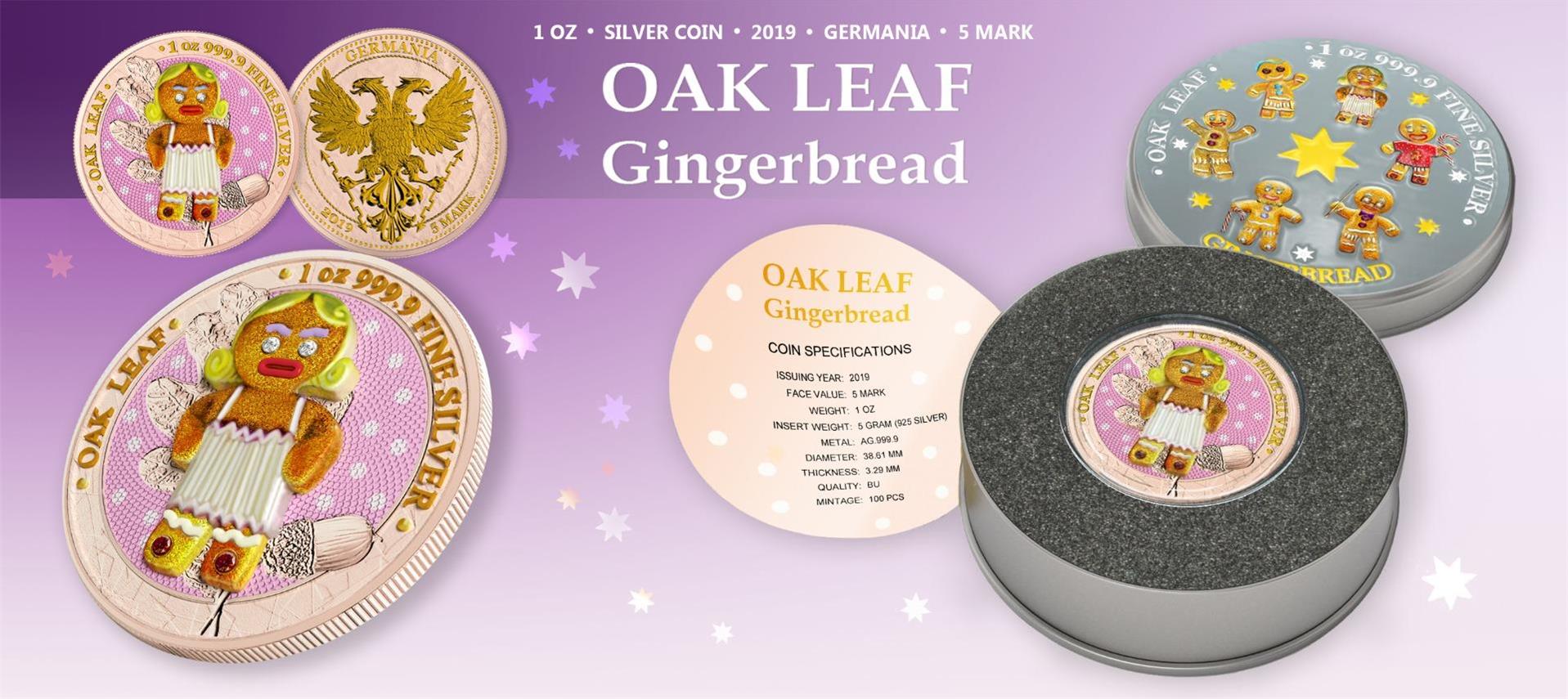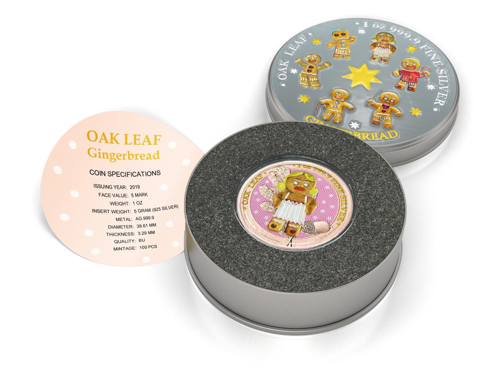 The Oak Leaf Germania 2019 Five Mark 3D Leaf Series - Lady Blondie Edition is an elegant and captivating coin that combines artistic beauty with a touch of playful sophistication. This one-ounce silver coin, part of the 3D Leaf Series, features a highly detailed oak leaf design with a sterling silver Lady Blondie insert, making it a stunning and unique collectible.