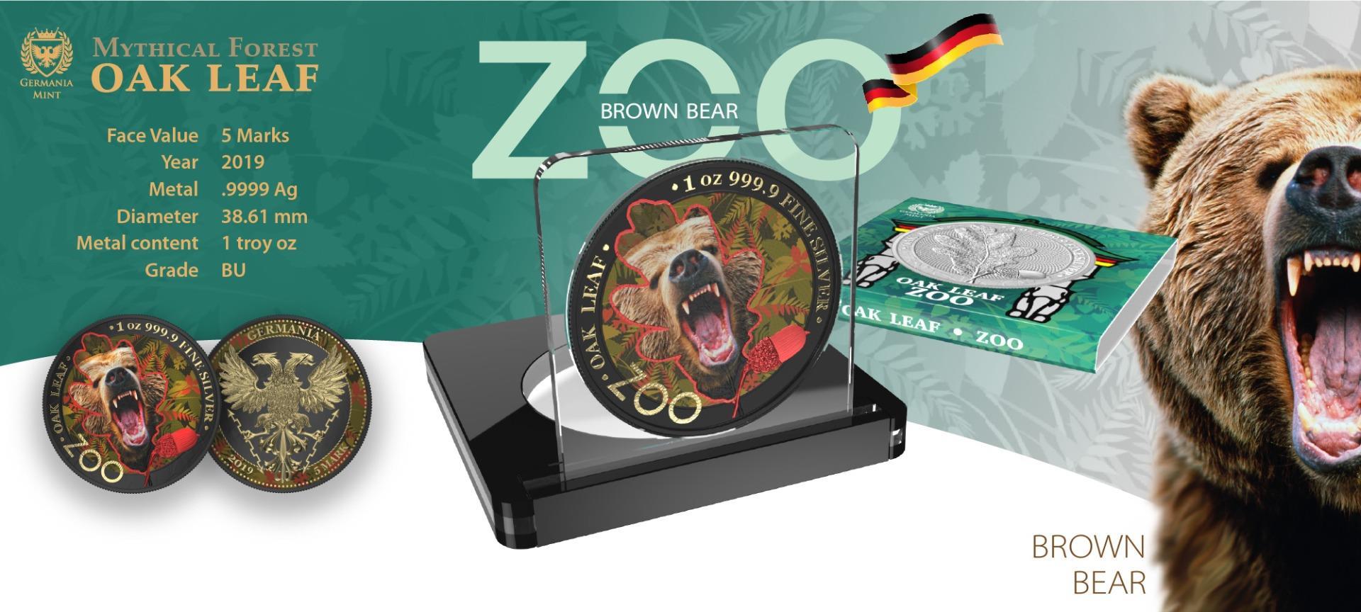 The Germania 2019 5 Mark Oakleaf Zoo Series 1oz Colored Silver Coin is a true masterpiece, limited to only 100 pieces. It features a majestic depiction of a bear alongside the intricate oakleaf motif, symbolizing strength and resilience. The bear, rendered in stunning detail, adds a powerful and imposing presence to the coin, making it a standout piece in the Zoo Series.