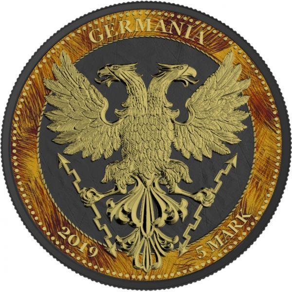 The Germania 2019 5 Mark Oakleaf Zoo Series 1oz Colored Silver Coin is a true masterpiece, limited to only 100 pieces. It features a majestic depiction of a lion alongside the intricate oakleaf motif, symbolizing strength and nobility. The lion, rendered in stunning detail, adds a powerful and regal presence to the coin, making it a standout piece in the Zoo Series.