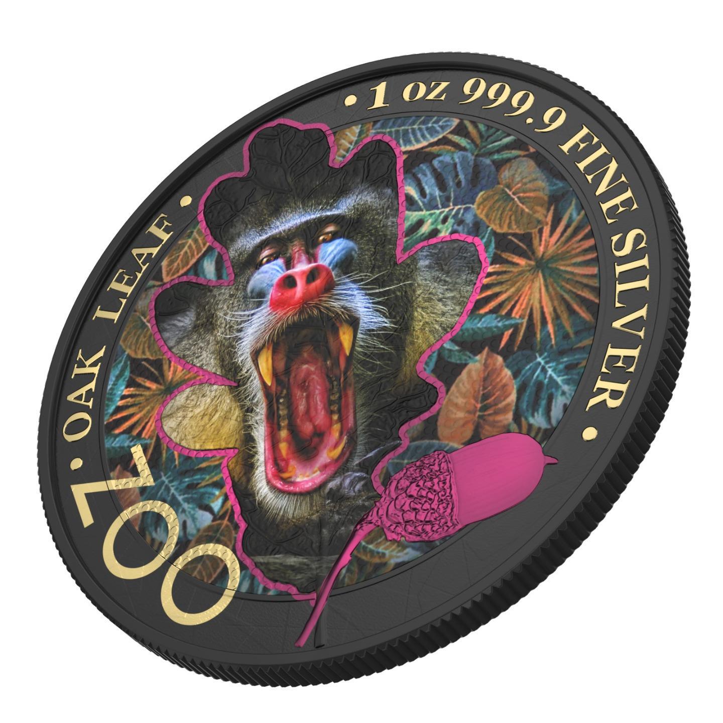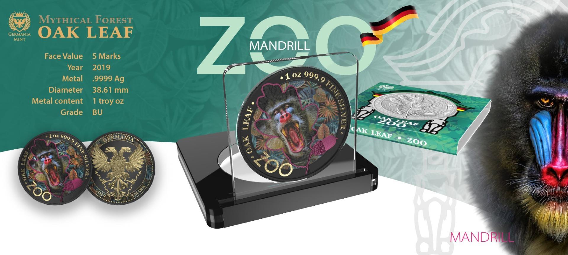 The Germania 2019 5 Mark Oakleaf Zoo Series 1oz Colored Silver Coin is a true masterpiece, limited to only 100 pieces. It features a striking depiction of a mandrill alongside the intricate oakleaf motif, symbolizing vitality and uniqueness. The mandrill, rendered in stunning detail, adds an exotic and vibrant presence to the coin, making it a standout piece in the Zoo Series.