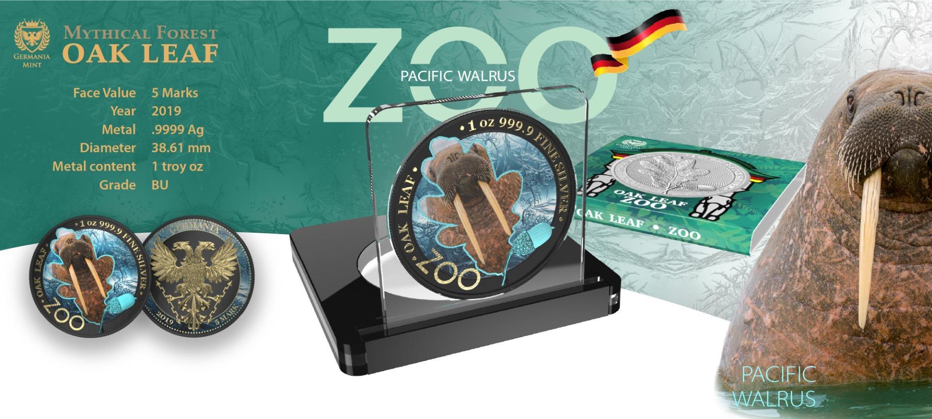 The Germania 2019 5 Mark Oakleaf Zoo Series 1oz Colored Silver Coin is a true masterpiece, limited to only 100 pieces. It features a majestic depiction of a walrus alongside the intricate oakleaf motif, symbolizing endurance and strength in harsh environments. The walrus, rendered in stunning detail, adds a distinctive and powerful presence to the coin, making it a standout piece in the Zoo Series.