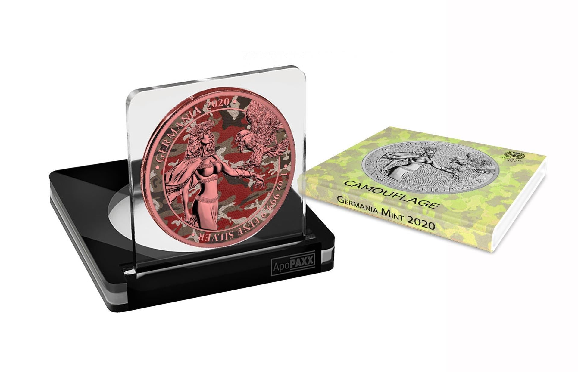 The Barbarossa version of the Camouflage Series is designed to captivate with its intricate, military-inspired camouflage pattern, skillfully applied to the coin’s surface. This detailed design not only reflects the spirit of strength and resilience but also embodies the high craftsmanship that the Germania Mint is renowned for. The coin’s obverse typically features allegorical figures or symbols, while the camouflage coloring brings a modern and striking contrast to the classical elements.