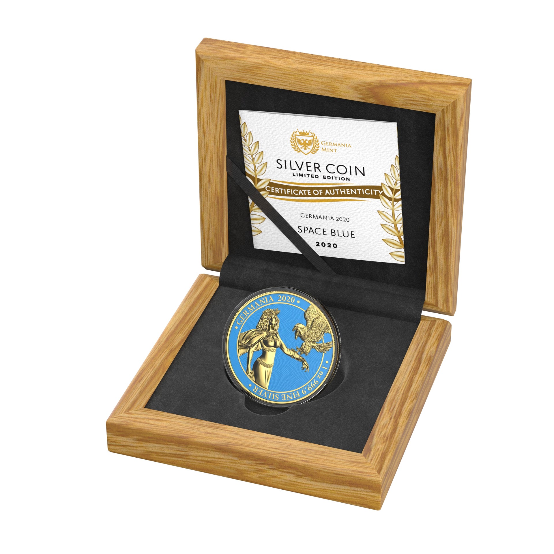 The coin is presented in an elegant wooden box, engraved by hand with the Germania logo using laser precision. This thoughtful detail elevates the unboxing experience, making it both luxurious and personal. The box also contains a certificate of authenticity, verifying the coin's limited mintage, high-quality silver content, and exclusive gold gilding, ensuring the collectible’s authenticity and value.