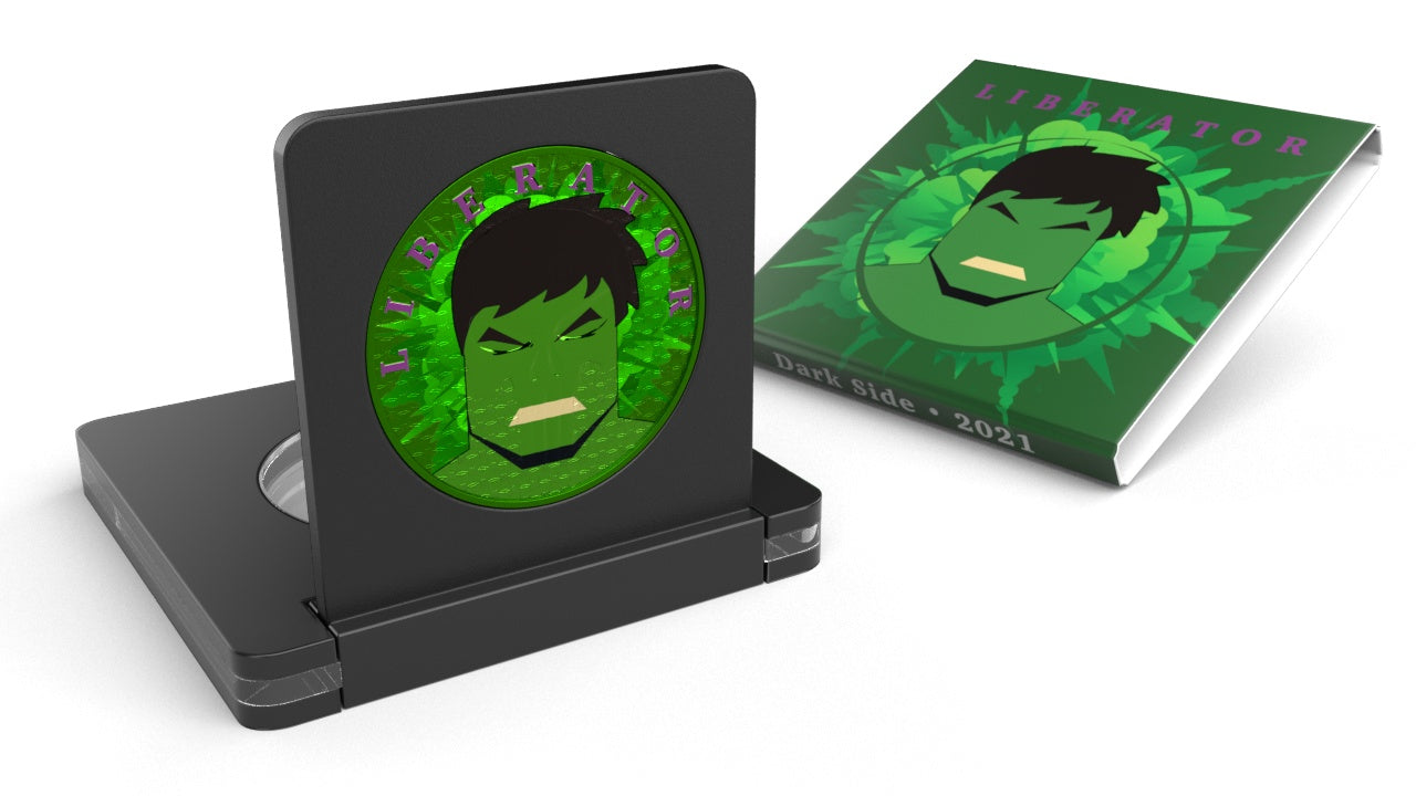 Struck with the highest precision and craftsmanship, this silver round showcases the Liberator DarkSide 2021 design, blending modern superhero elements with a dark, dramatic aesthetic. It includes a fantasy superhero, our own interpretation of Hulk, distinct from the well-known character, offering a fresh and creative take on the superhero theme.