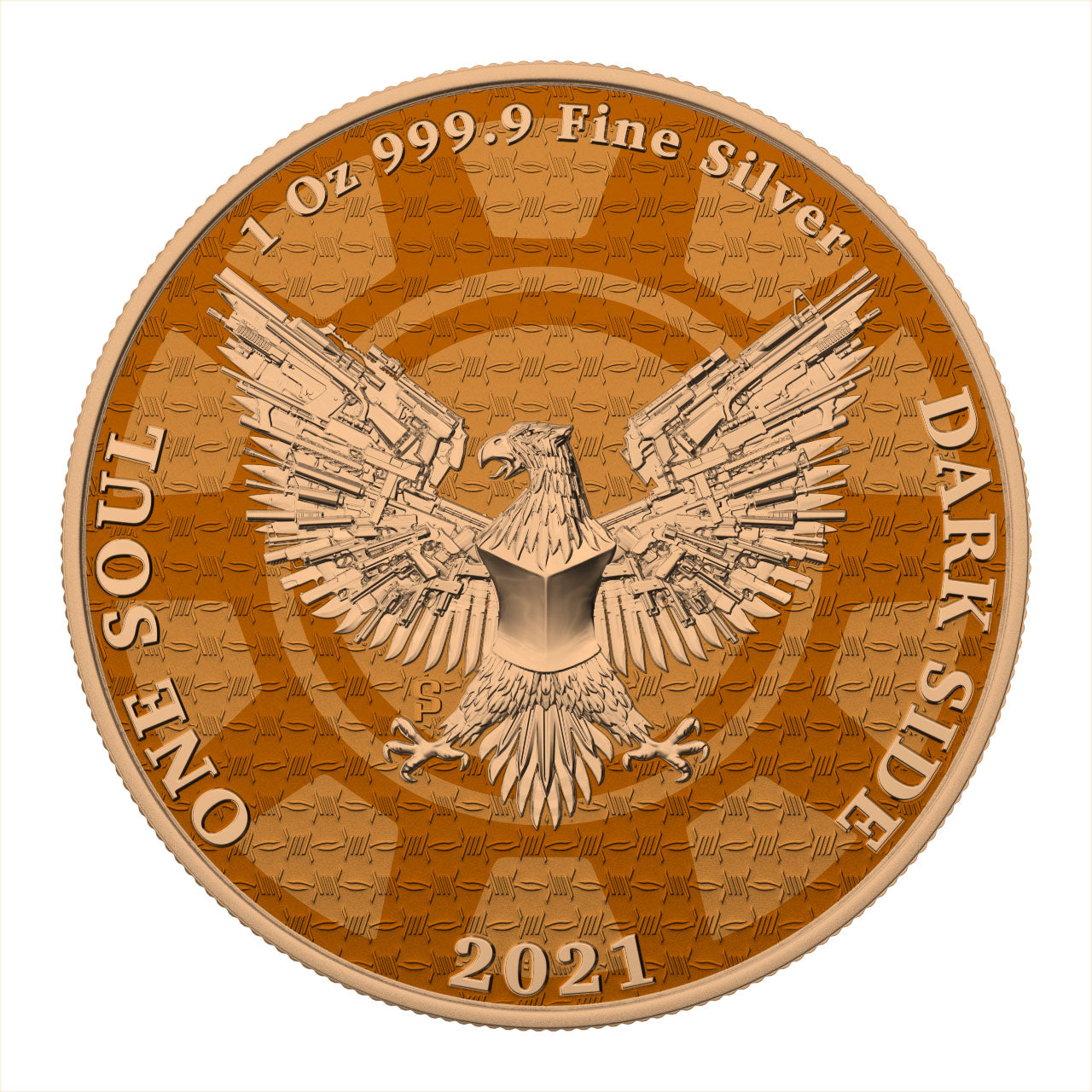 Struck with the highest precision and craftsmanship, this silver round showcases the Liberator DarkSide 2021 design, blending modern superhero elements with a dark, dramatic aesthetic. It includes a fantasy superhero, our own interpretation of Iron Man, distinct from the well-known character, offering a fresh and creative take on the superhero theme.