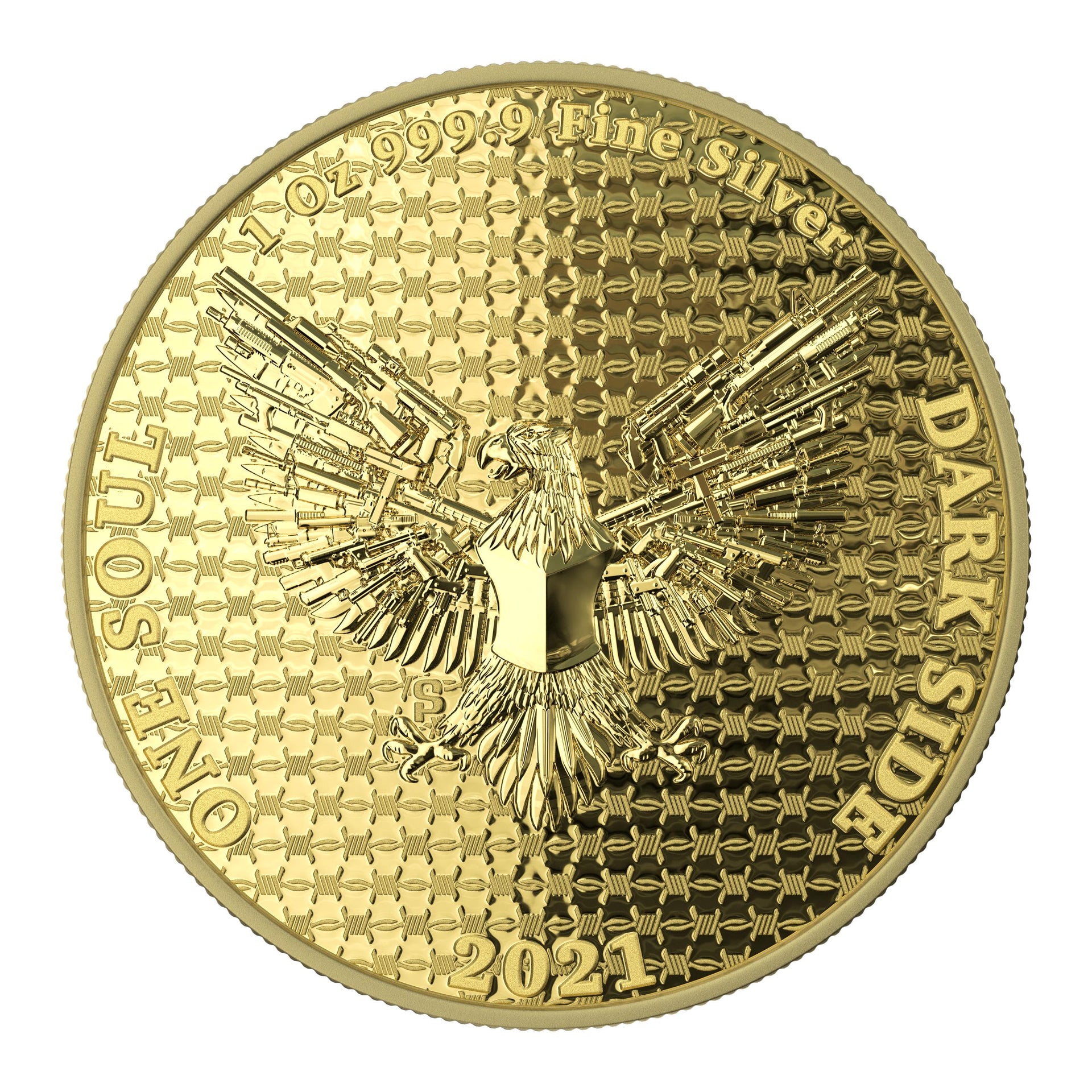 The Dark Side 2021 1 Soul Proof Liberator Silver 1 Oz Yellow Gold Proof is a stunning creation from JVP Mint, known for producing exceptional and innovative numismatic pieces. This edition stands out as the yellow gold version of the coin, featuring a striking yellow gold proof finish that enhances its rich and luxurious appearance. Limited to just 100 pieces, this exclusive release is crafted from 999.9 fine silver, with a weight of 1 troy ounce.