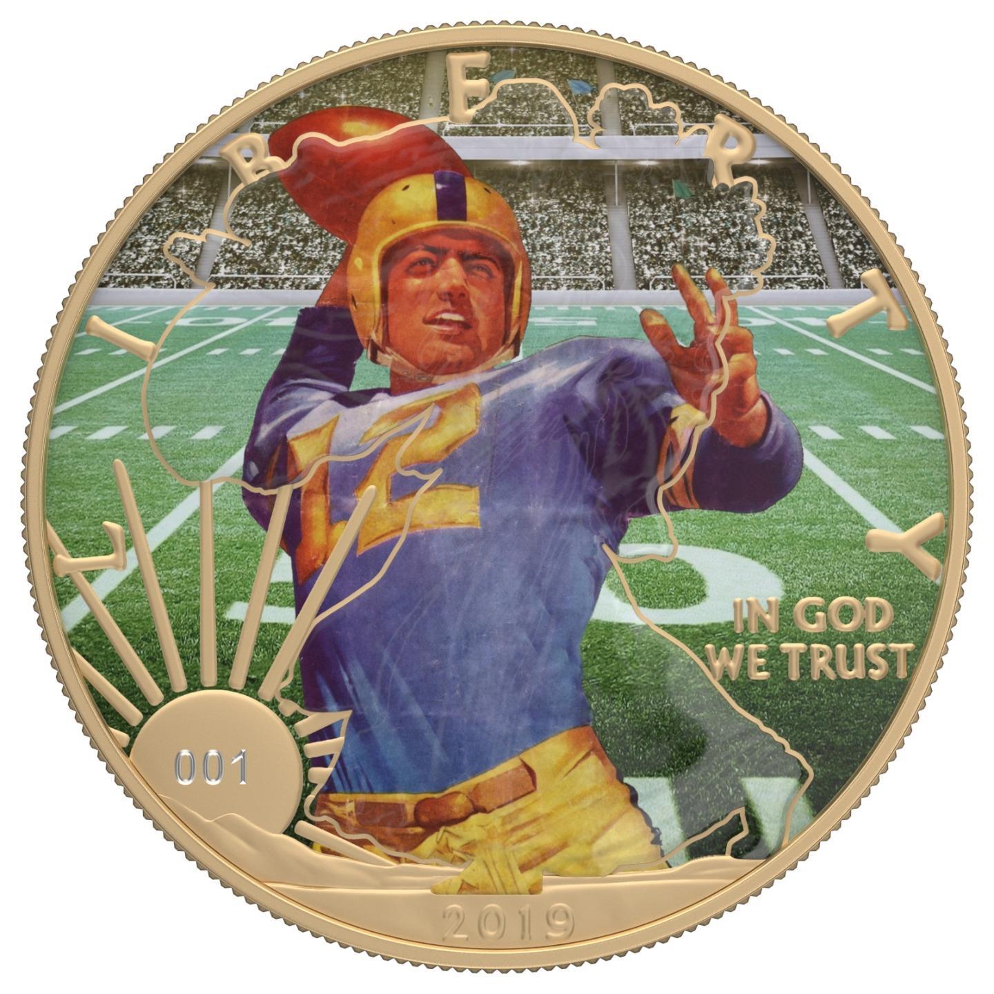 The 2019 USA Silver Eagle $1, 1 oz silver coin is a standout piece from the "Faces of America" series, known as the **Tom Davies Edition**. With a limited mintage of only 100 pieces, this coin is a highly prized collectible, featuring stunning colored and gilded silver accents.