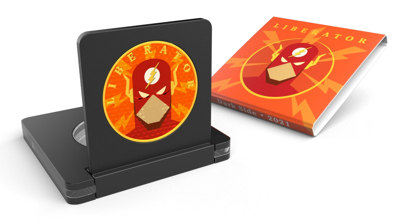 Struck with the highest precision and craftsmanship, this silver round showcases the Liberator DarkSide 2021 design, blending modern superhero elements with a dark, dramatic aesthetic. It includes a fantasy superhero, our own interpretation of Flash, distinct from the well-known character, offering a fresh and creative take on the superhero theme.