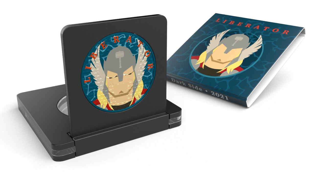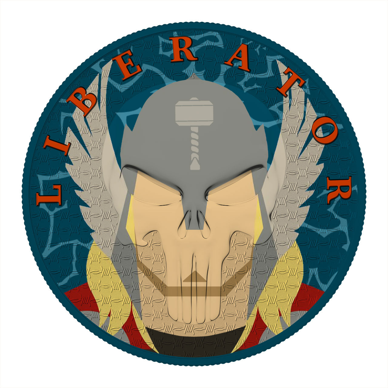 Struck with the highest precision and craftsmanship, this silver round showcases the Liberator DarkSide 2021 design, blending modern superhero elements with a dark, dramatic aesthetic. It includes a fantasy superhero, our own interpretation of Thor, distinct from the well-known character, offering a fresh and creative take on the superhero theme.
