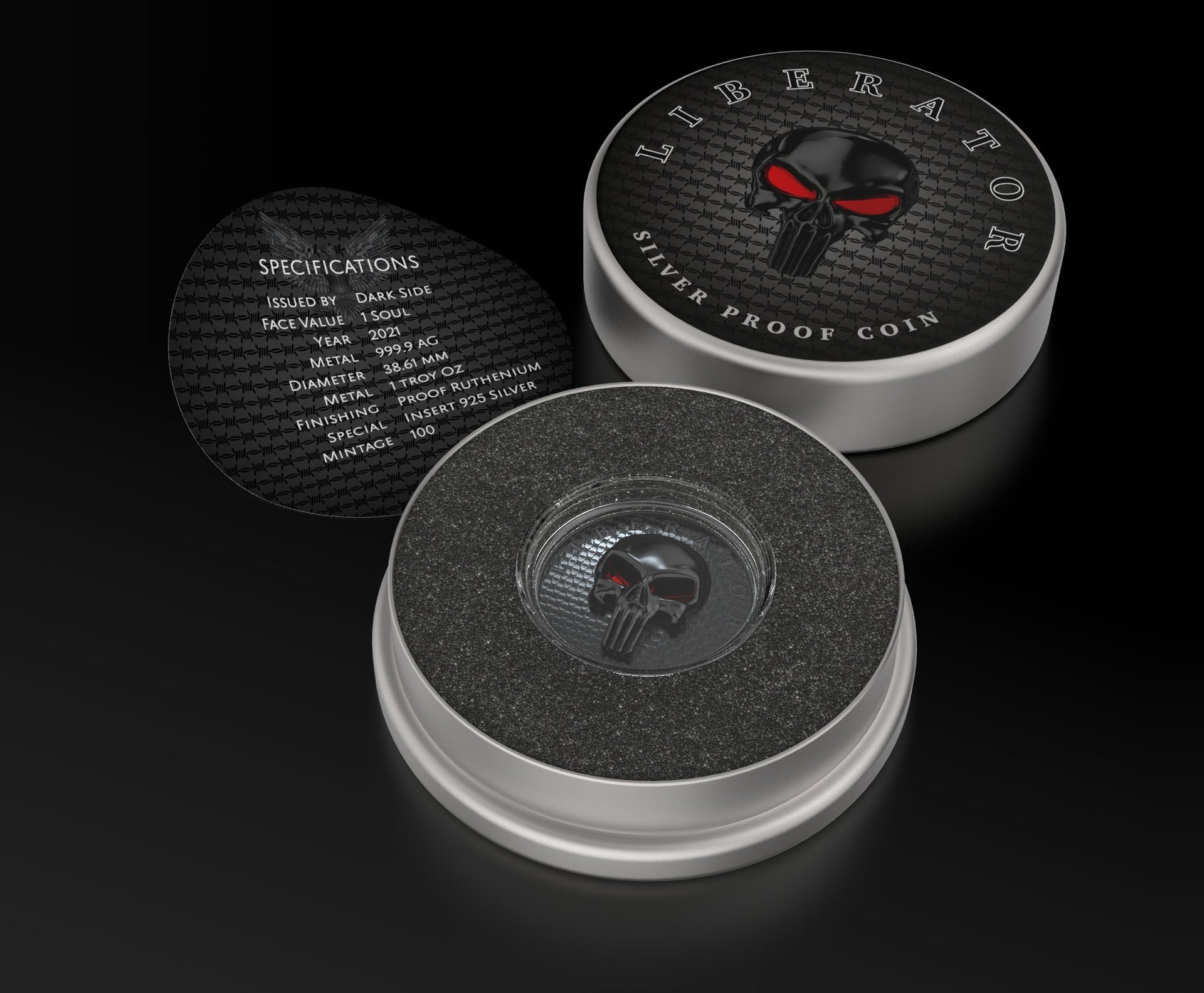 The Dark Side 2021 1 Soul Proof Liberator Silver 1 Oz Black Proof is a stunning creation from JVP Mint, known for producing exceptional and innovative numismatic pieces. This edition stands out as the black version of the coin, featuring a striking black proof finish that enhances its dark, dramatic appearance. Limited to just 100 pieces, this exclusive release is crafted from 999.9 fine silver, with a weight of 1 troy ounce.