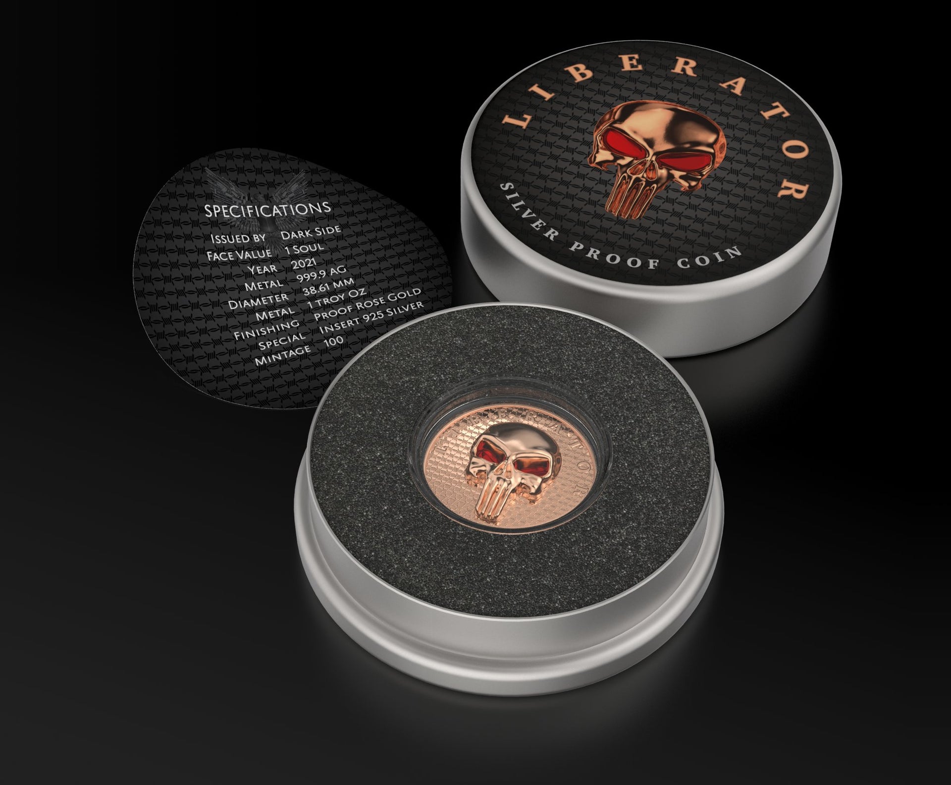 The Dark Side 2021 1 Soul Proof Liberator Silver 1 Oz Rose Gold Proof is a stunning creation from JVP Mint, known for producing exceptional and innovative numismatic pieces. This edition stands out as the rose gold version of the coin, featuring a striking rose gold proof finish that enhances its rich, elegant appearance. Limited to just 100 pieces, this exclusive release is crafted from 999.9 fine silver, with a weight of 1 troy ounce.