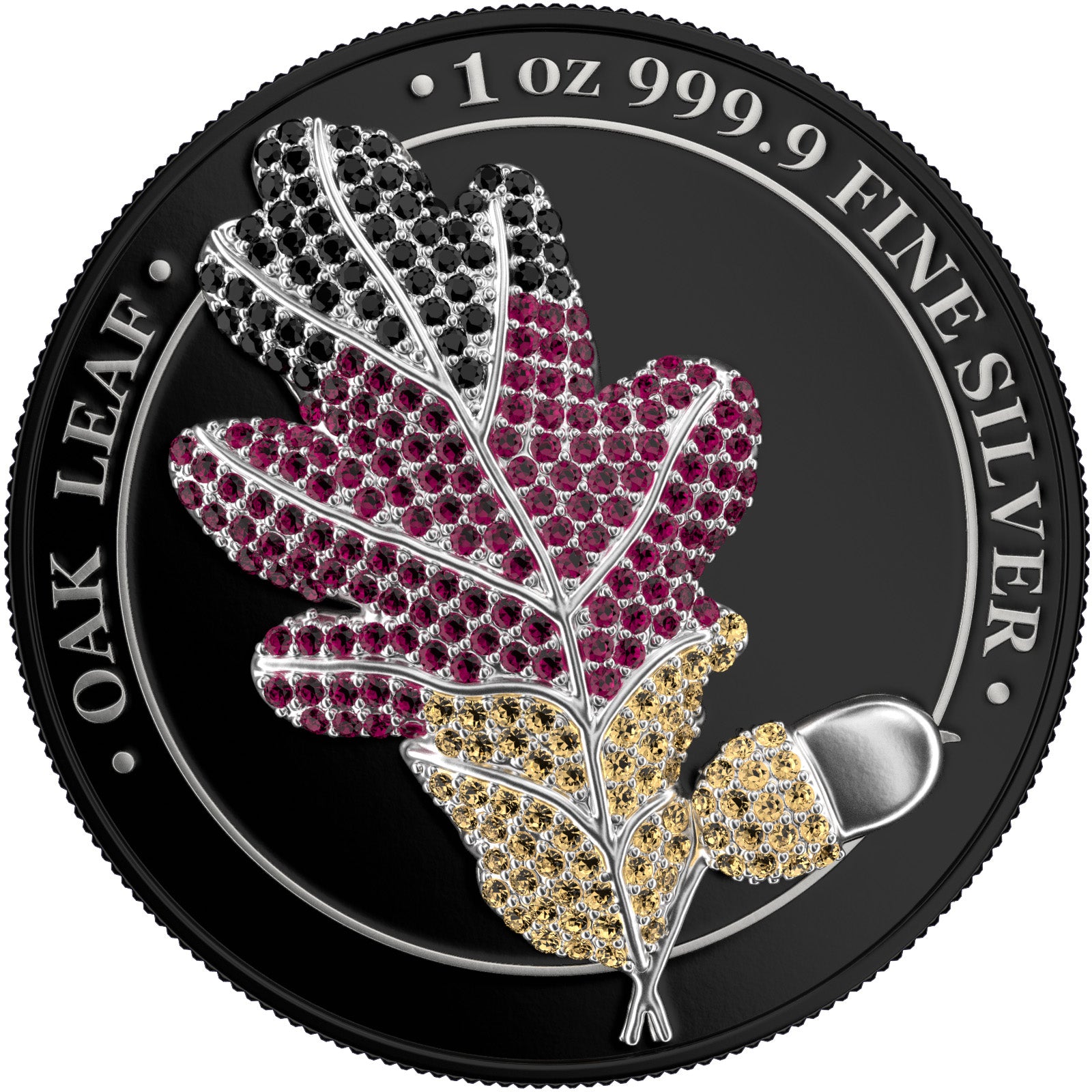 The Oak Leaf Germania 2019 Five Mark 3D Leaf Series - German Flag Edition is an extraordinary coin that combines symbolic national pride with luxurious craftsmanship. This one-ounce silver coin, part of the prestigious 3D Leaf Series, features a highly detailed oak leaf in a striking black proof finish, adorned with vibrant elements of the German flag and Swarovski crystals, making it a true standout for collectors.
