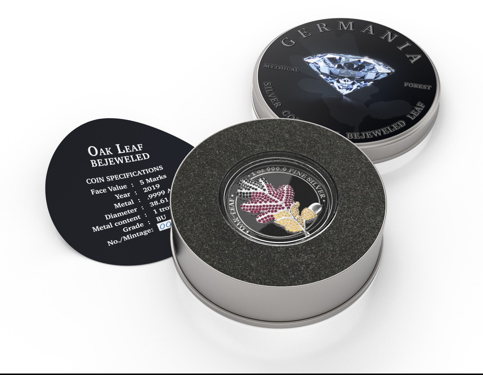 Presented in premium packaging, the Oak Leaf German Flag Edition comes complete with a certificate of authenticity, underscoring its rarity and appeal among collectors. With its bold German flag colors, sleek black proof finish, 3D craftsmanship, and sparkling Swarovski crystals, this coin is a must-have for those who value the fusion of national symbolism and exquisite artistry in numismatics.