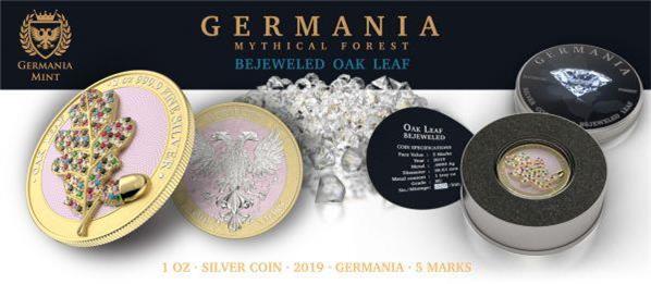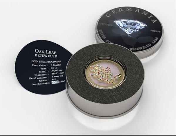 The Oak Leaf Germania 2019 Five Mark 3D Leaf Series - Yellow Edition is a breathtaking creation from the Germania Mint, blending artistic innovation with luxurious embellishments. This one-ounce silver coin, part of the exclusive 3D Leaf Series, features a finely detailed oak leaf enhanced by dazzling Swarovski crystals, making it a standout piece in any collection.