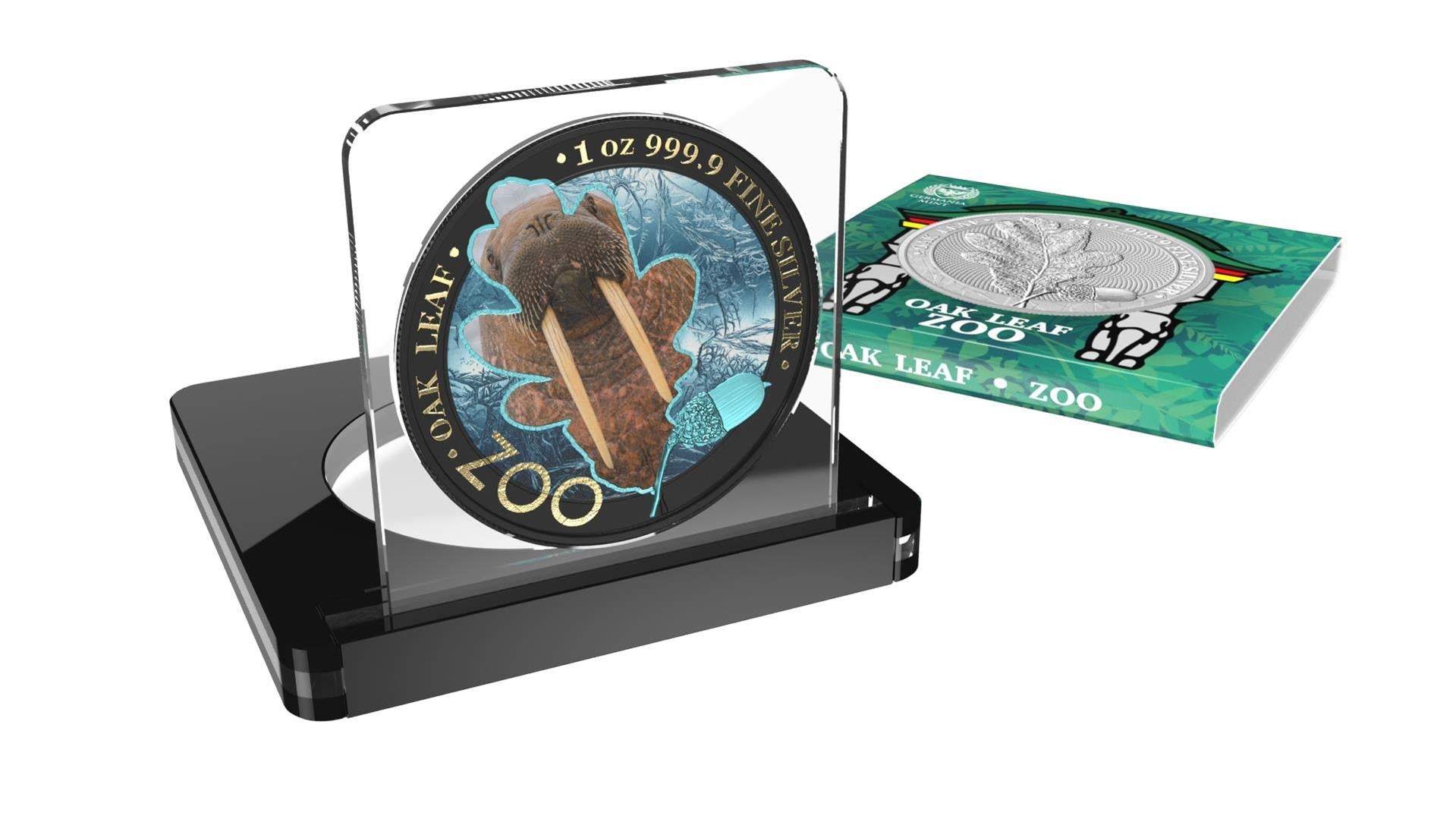 The Germania 2019 5 Mark Oakleaf Zoo Series 1oz Colored Silver Coin is a true masterpiece, limited to only 100 pieces. It features a majestic depiction of a walrus alongside the intricate oakleaf motif, symbolizing endurance and strength in harsh environments. The walrus, rendered in stunning detail, adds a distinctive and powerful presence to the coin, making it a standout piece in the Zoo Series.