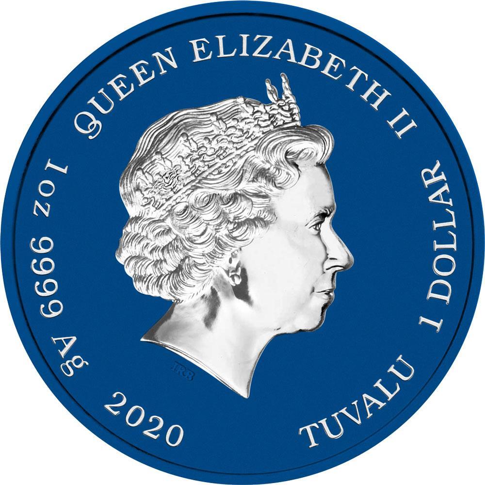 The Tuvalu 2020 $1 "Krusty the Clown" silver coin in the "Space Blue College Edition" is a special collector's coin produced in a limited edition of only 100 pieces. This colored coin is made from one ounce (31.1 g) of pure silver with a fineness of 99.99%. It features the famous character Krusty the Clown from the popular TV series "The Simpsons," standing confidently with space blue hair, embodying a unique and collegiate style. The image is colored using metallic shades, primarily in a striking space blue tone, which gives the coin a unique sheen and depth, enhancing the detailed portrayal of Krusty and providing a dynamic, reflective appearance that captures the essence of the character with an added touch of sophistication.