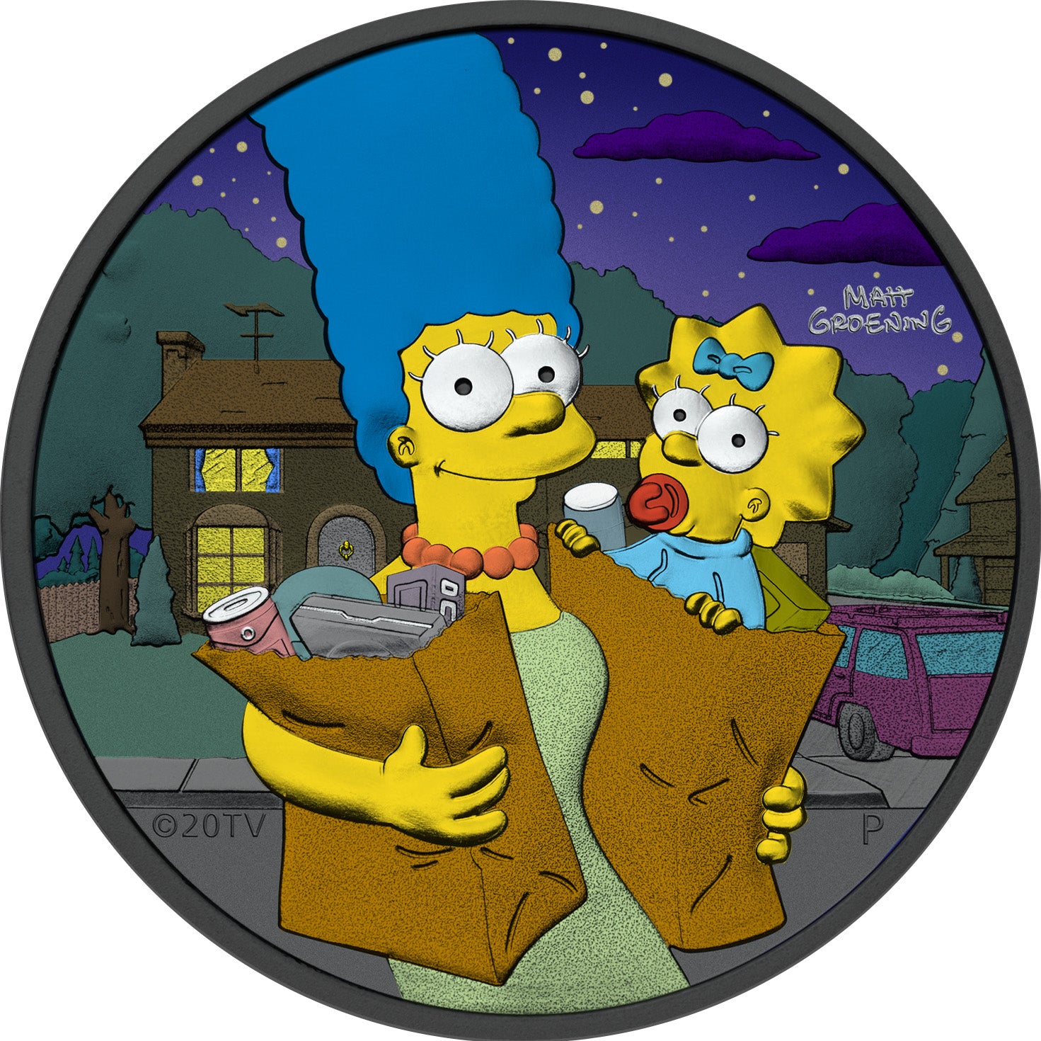 The Tuvalu 2021 $1 "Marge & Maggie" silver coin is an extraordinary addition to any Simpsons fan’s collection, especially for those who value exquisite craftsmanship and unique finishes. This coin is part of the highly coveted Marge & Maggie coin series and represents the "Night Version," capturing the serene and loving bond between Marge and Maggie in a captivating, moonlit setting. Crafted from one ounce (31.1 g) of pure silver with a fineness of 99.99%, this coin features a striking combination of vibrant coloring against a luxurious ruthenium finish, giving it an alluring contrast and depth that truly brings the nighttime scene to life.