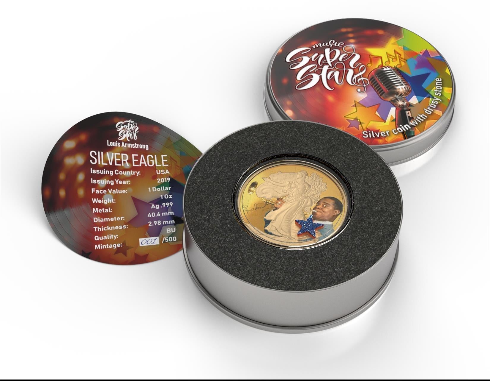 USA 2019 1$ American Eagle Superstar Series Louis Armstrong 1 Oz Bejeweled Silver Coin