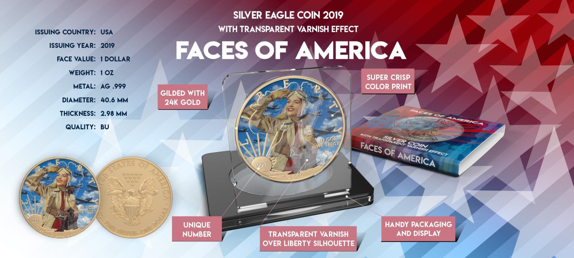 USA 2019 1$ Faces of America 1 Oz Colored Gilded Silver Coin Roaring Sky
