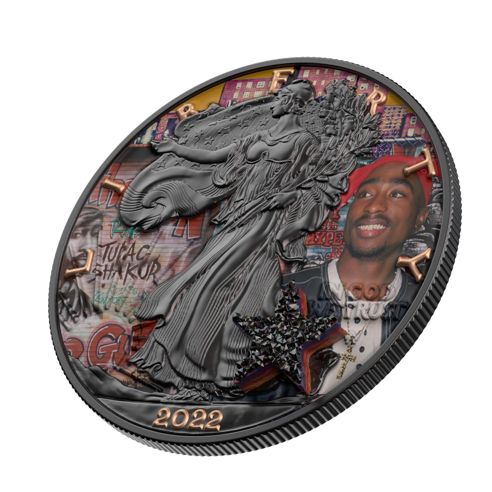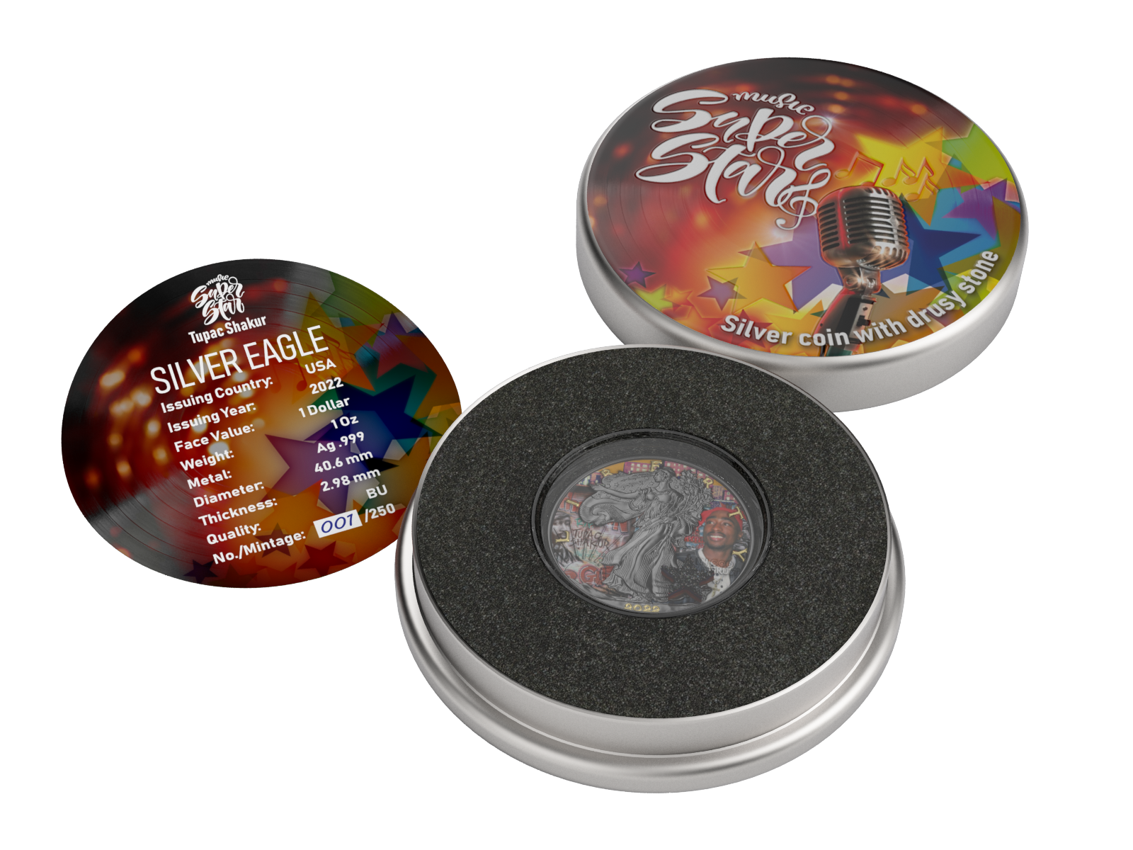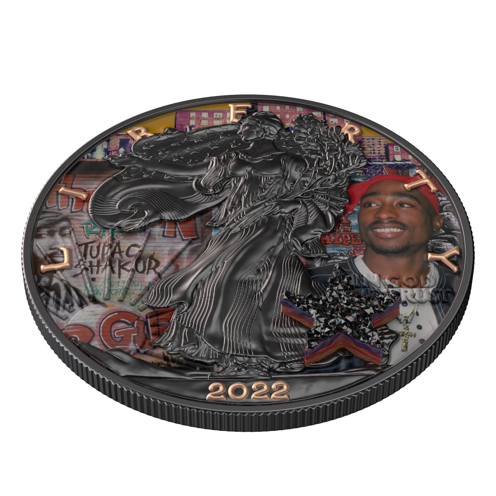 The USA 2022 $1 American Eagle "Superstar Series 2-Pac Shakur Edition" is a remarkable tribute to the legendary rapper and cultural icon, 2-Pac Shakur. This 1-ounce bejeweled silver coin is crafted from pure silver with a fineness of 99.9%, and features a dazzling design that captures the essence of 2-Pac's legacy. What truly sets this coin apart is the incorporation of a real druzy stone, adding a layer of brilliance and texture that makes it a standout piece in any collection. The intricate details and bejeweled accents pay homage to 2-Pac's impact on music and culture, making it a unique collector's item.